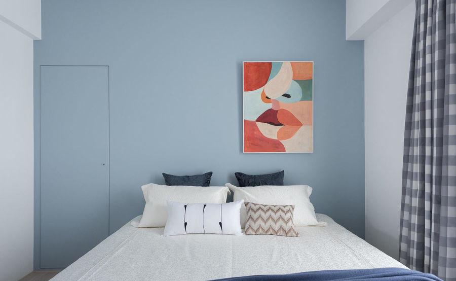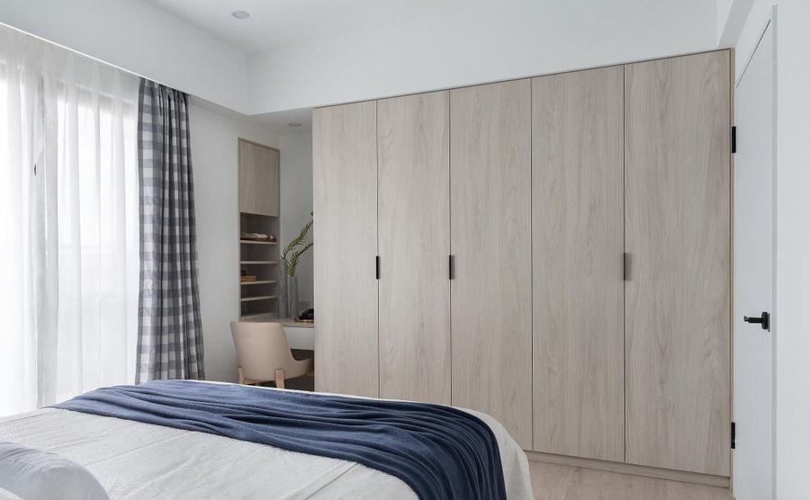 ▲ 主卧除了摆放一张床外,床头双方的宽度皆所剩无几了,背后还有一个主卫,用隐形门的设想,将门与墙面如胶投漆,保捏了墙面的竣工,让空间不至于被门洞切割分红几块,这也就在一定进程上放大了空间。床尾除了一面无把手的衣橱外,还预留了一个小小的梳妆区,算是将空间哄骗到极致了,恬淡的配色,能起到舒徐东说念主心的作用,增多承诺性。