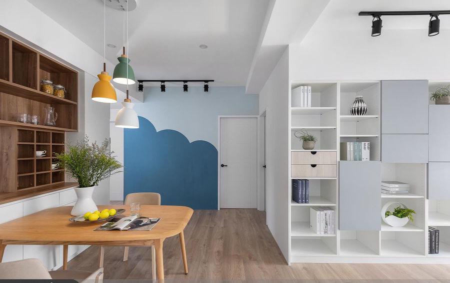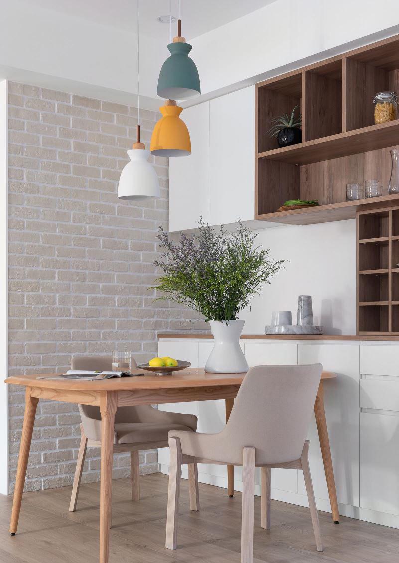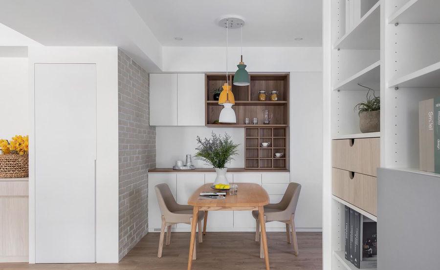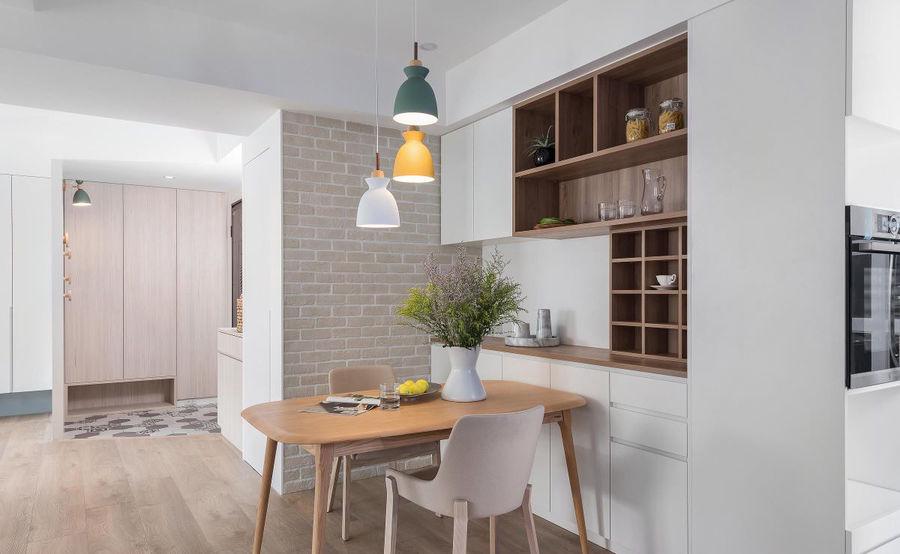 ▲ 餐厅两侧的布景墙,一侧领受文化砖铺面来增多好意思不雅性,一侧定制餐边柜来增多实用性,再点缀三盏彩色的北欧风吊灯,小小的就餐区也显得特地的端淑有作风。