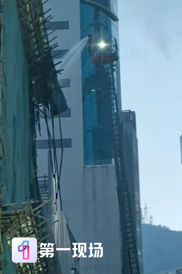 下昼6点,记者在现场看到,大楼已无明火和浓烟,空气中也莫得烟味。一台超高云梯车仍在高空向活气位置捏续洒水。
