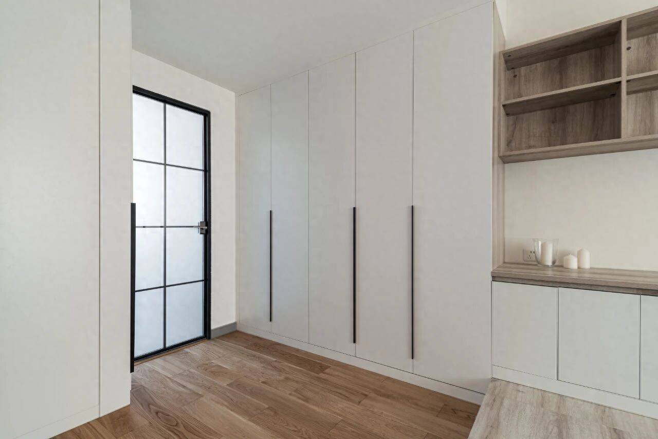③门板防迂回:柜门高度跳跃2.4米,一定要装拉直器,板材选欧松板,比多层板更抗变形。