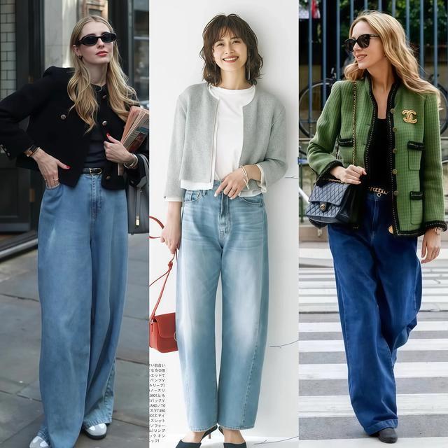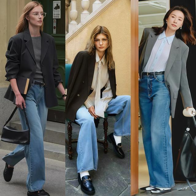 牛仔外衣配阔腿裤再踩一对小低跟,这套搭配自带复旧滤镜,牛仔面料自己就有年代感,配上阔腿裤宽松的裤管和小低跟鞋的圆头或方头联想,九十年代的街头滋味胜仗到位。