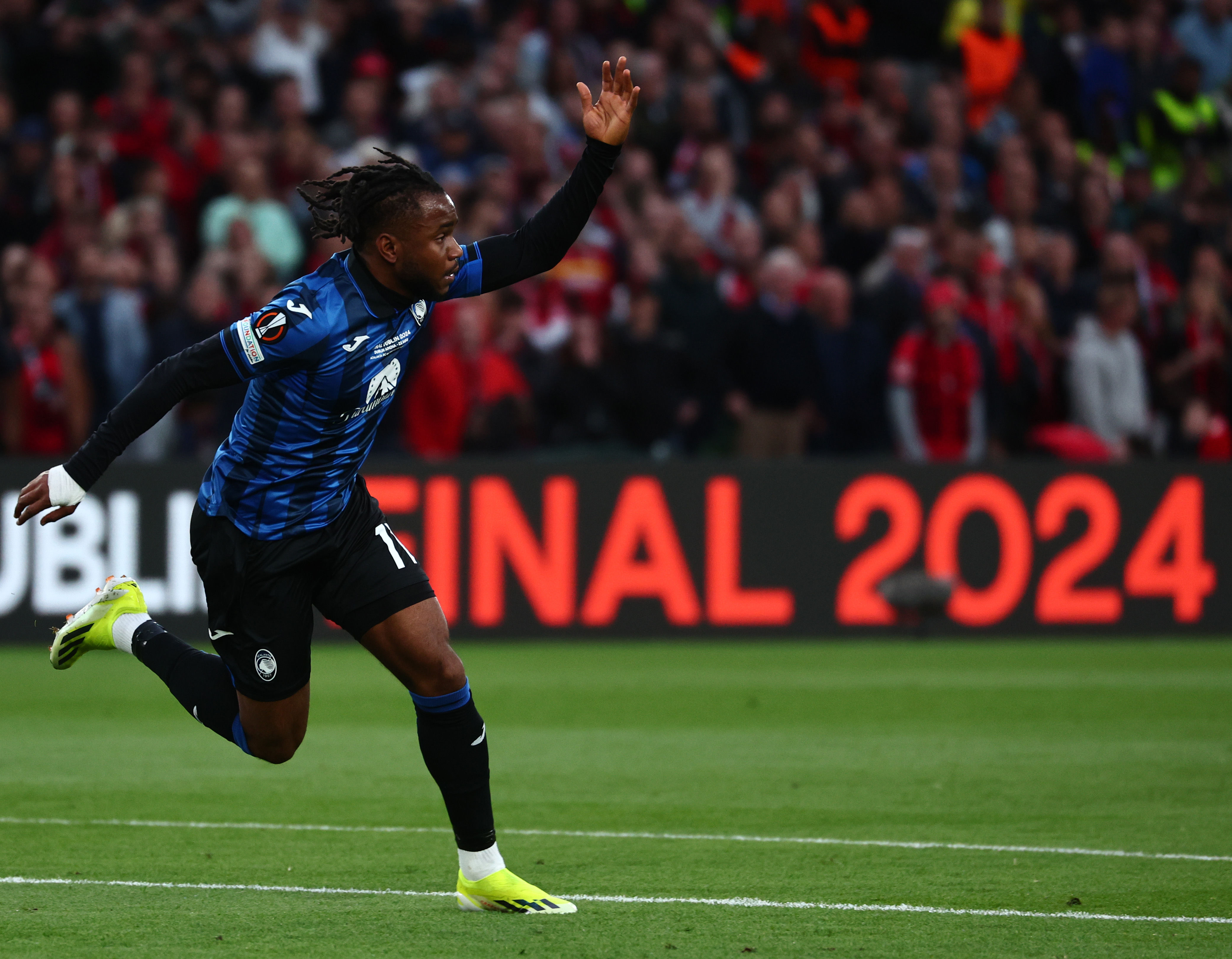 5月22日,亚特兰大队球员卢克曼(左一)在比赛中射门攻入第一粒进球。卢克曼在本场比赛中打进三球,演出“帽子戏法”。