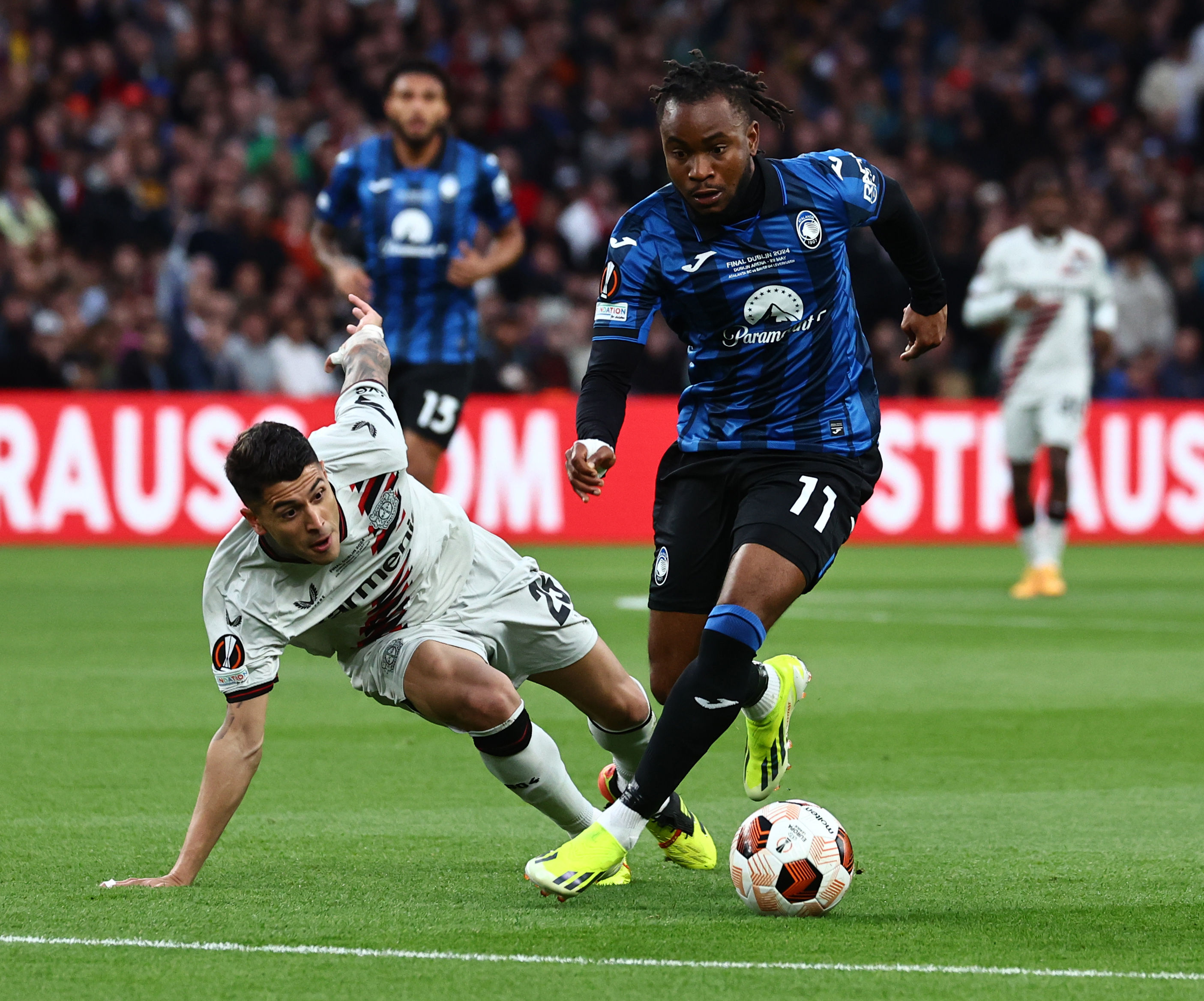 5月22日,亚特兰大队球员卢克曼(右)与勒沃库森队球员帕拉西奥斯在比赛中拼抢。