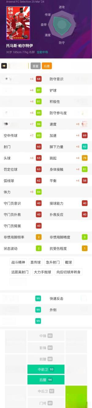 球员简析:帕尔特伊(精)是游戏所怜爱的中场类型,玄虚修养相对全面,但单项关键智力的强度不够顶级,因此实力与毕业球员有一定差距。