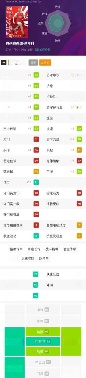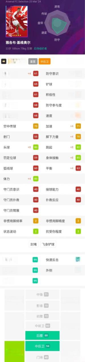 球员简析:这个版块的基维奥尔(精)注册位置并非左后卫,且客串左后卫的热区为浅绿色,出任正印中卫的话,关键属性的强度还莫得优秀到可以让东说念主忽略手段、速率和景况的不及,全体来看实力一般,非队套玩家兑换的性价比不是很高。