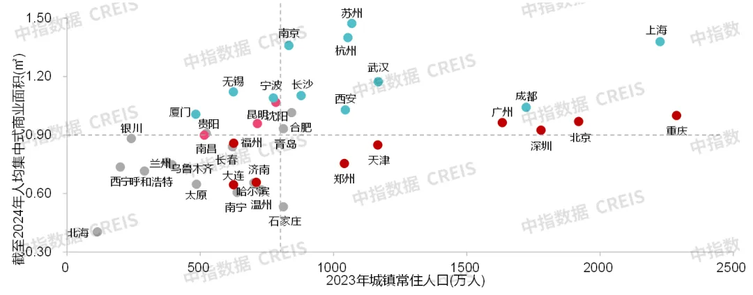 以2023年末城镇常住东说念主口策动,截止2024年末,我国城镇东说念主均聚首式买卖面积约0.6平时米,举座增量拓荒空间已较小。一线城市存量边界已较大,东说念主均聚首式买卖面积约1.1平时米,将来存量形式的竞争将愈加利害;二线城市城镇东说念主均聚首式买卖面积约0.9平时米,接近一线城市水平,部分城市存在买卖形式多余的风险;三四线城市面前城镇东说念主均聚首式买卖面积仍较小,约为0.4平时米,但巨额三四线城市东说念主口基数小、滥用才气不及,企业策动靠近挑战。