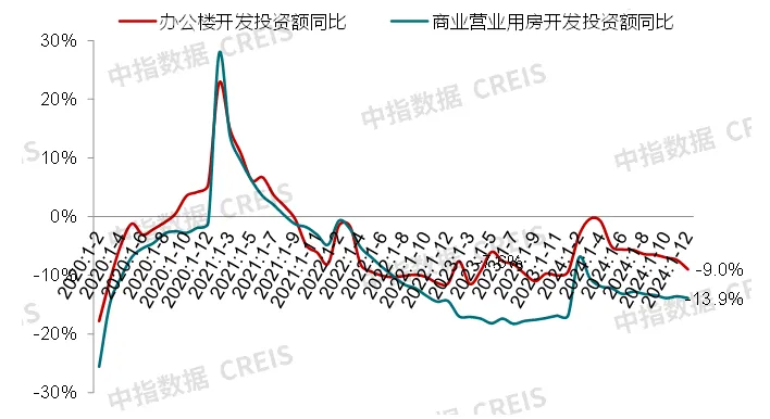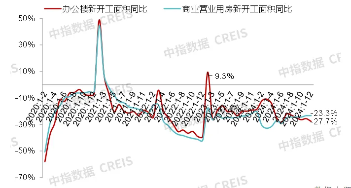 1、商办用房投资开工:2024年商办用房拓荒投资额下降12.1%,新开工面积下降24.6%