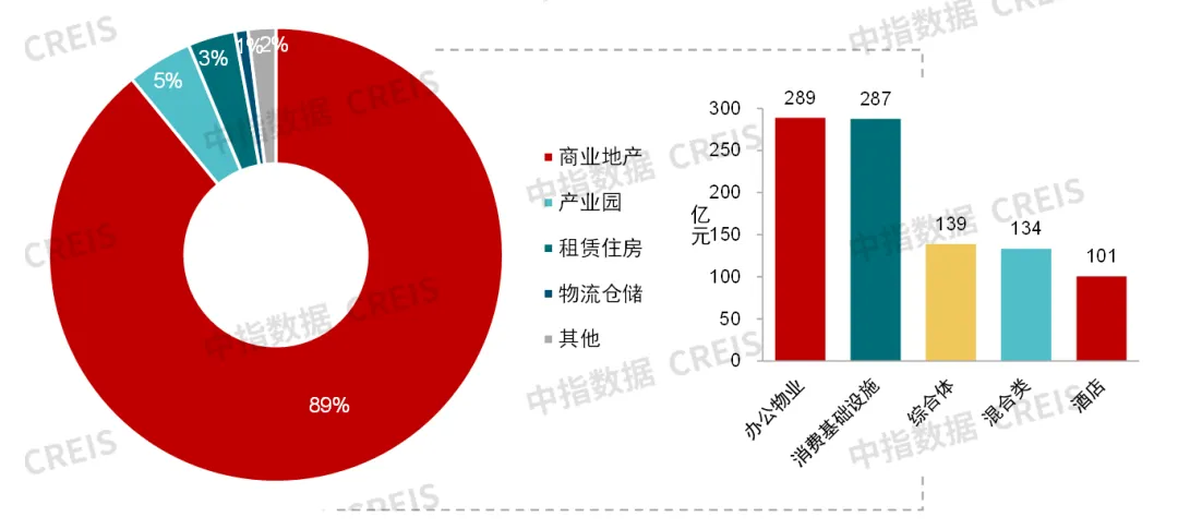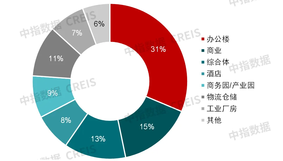 以买卖地产(办公物业、滥用基础法子、空洞体、酒店、混杂类)为底层资产的产物刊行金额为949亿元,占比89%;其中底层资产为办公物业、滥用基础法子的产物刊行量各占27%,较2023年别离下降14个百分点、提高6个百分点;底层资产为空洞体、酒店、混杂类的产物刊行量占比整个约35%,较2023年提高约3个百分点;底层资产为产业园、租借住房、物流仓储偏激他物业类型的产物刊行金额均在50亿元以内,整个占比11%。