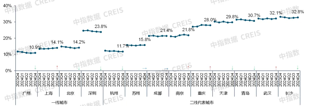 图:2023年四季度-2024年四季度重心城市甲级写字楼空置率