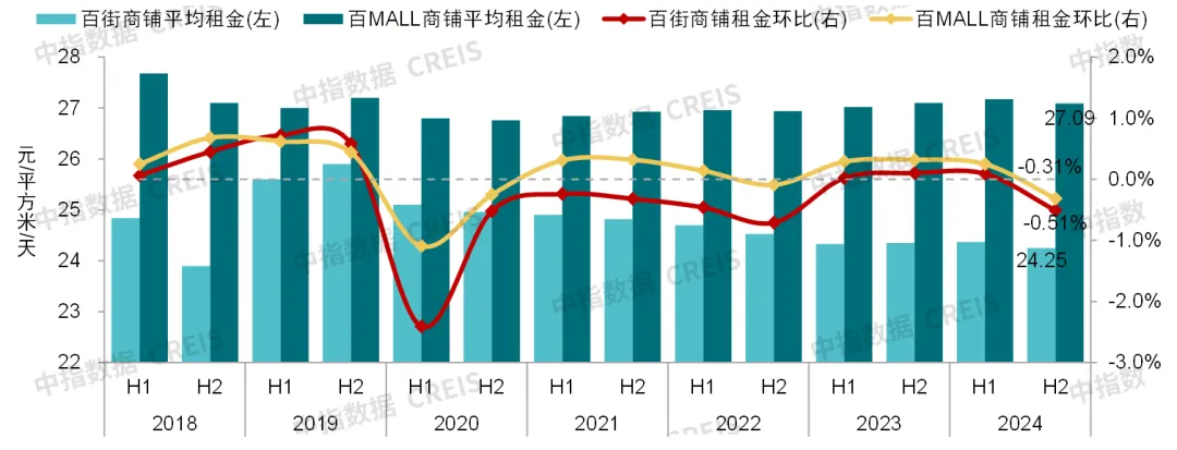 (1)商铺租借:2024下半年,买卖街商铺房钱环比下降0.51%,商圈(购物中心)房钱环比下降0.31%