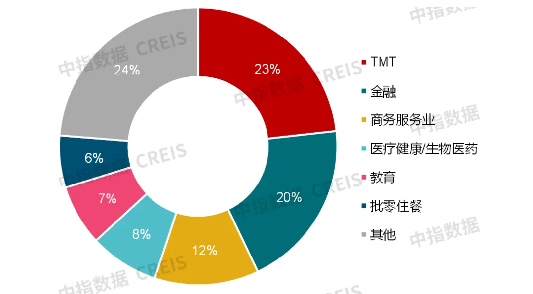 2024年前三季度,中指共监测到重心城市租借案例198笔,其中TMT、金融、商务服务业企业整个占比超五成,承租需求相对较多。具体来看,TMT行业监测到46宗案例,占比约23%;金融业监测到39宗案例、商务服务业监测到24宗案例,占比别离为20%、12%;医疗健康/生物医药、老师、批零住餐三大类行业监测案例在10-20宗之间,占比在6%-10%之间;其他行业监测案例共计47宗,整个占比24%。与2023年同期比拟,TMT、医疗健康/生物医药、老师企业租借案例占比有所进步,商务服务业、建筑和房地产业企业租借案例占比有所下降。