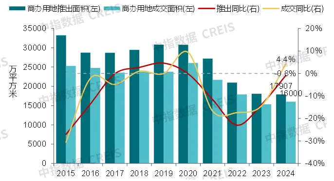 凭据中指数据,2024年300城商办用地共推出1.79亿平时米,同比微幅下降0.8%,成交1.6亿平时米,同比小幅增长4.4%;地皮供需边界均处近10年低位,拿地企业中央国企占比较大。