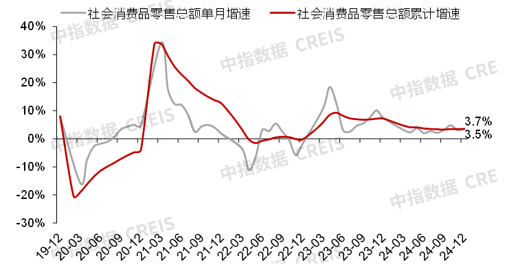 图:2019年12月-2024年12月社会滥用品零卖总额单月及累计同比增速