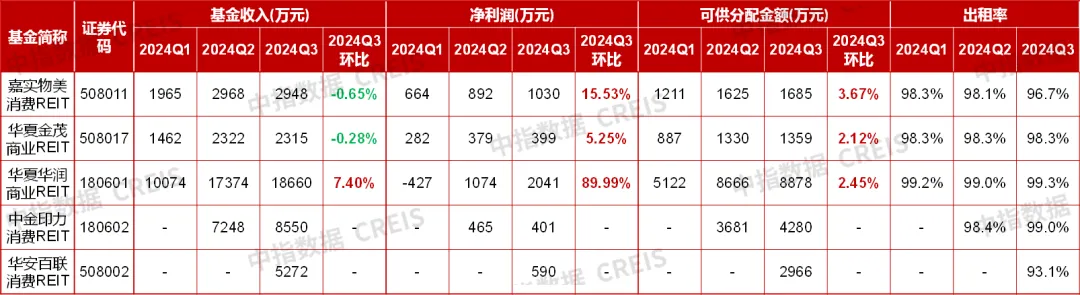 已发布三季报的五支滥用REITs产物底层资产运营沉稳,出租率保捏较高水平。凭据各产物三季报数据,2024年9月末,五支滥用REITs产物的底层资产出租率均在90%以上。其中中原金茂买卖REIT、中原华润买卖REIT、中金印力滥用REIT底层资产形式出租率均在98%以上,基本处于满租气象。嘉什物好意思滥用REIT四个形式举座出租率为96.7%,较二季度下降1.4个百分点;华安百联滥用REIT底层资产出租率为93.1%,为五只产物中最低。