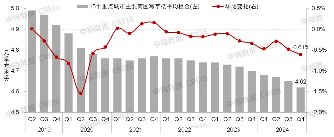 (2)写字楼租借:2024年四季度重心城市主要商圈写字楼房钱环比下降0.61%,全年累计下降1.85%