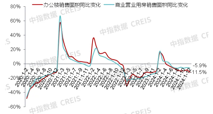 图:2020-2024年办公楼及买卖营业用房新开工面积月度累计同比变化