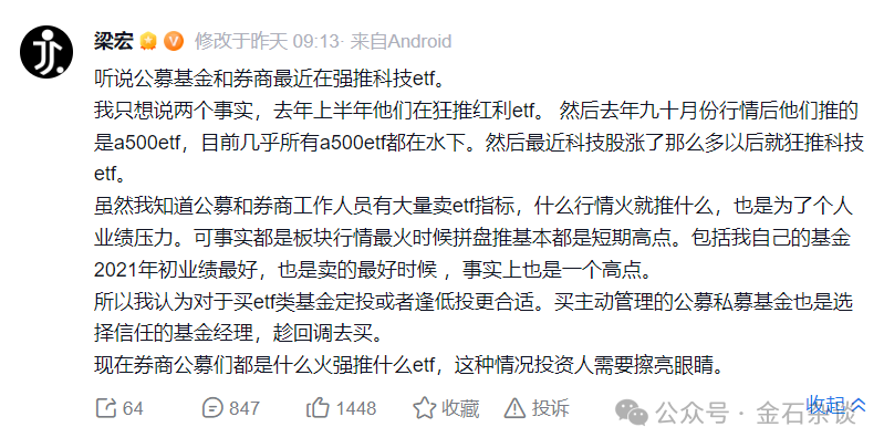 不外,2月22日,梁宏再度教唆风险:外传公募和券商齐在强推科技ETF,只说两个事实,旧年上半年他们狂推红利,旧年9月狂推A500ETF,A500ETF已在水下,然后最近科技股涨了那么多后就狂推科技ETF,当今券商公募们齐是什么火强推什么etf,这种情况投资东说念主需要擦亮眼睛。