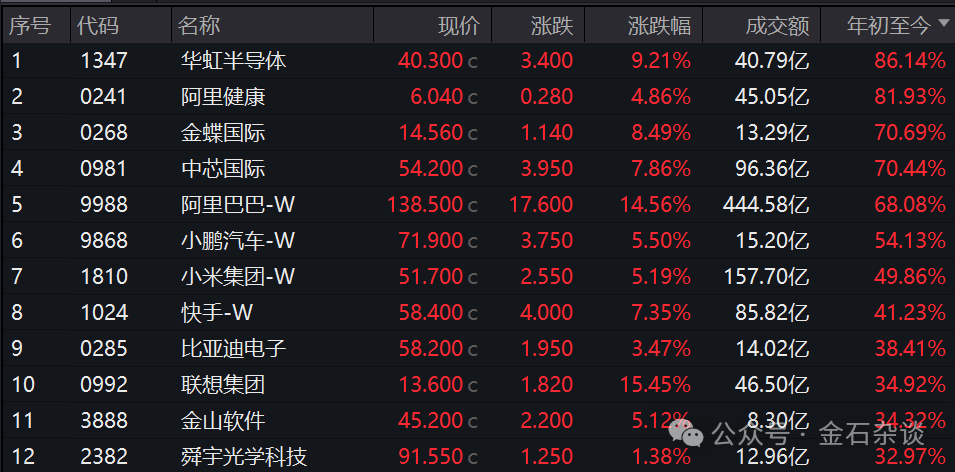 本年涨幅来看,享有十杰之称的中芯外洋本年涨幅高达70%,小米涨近50%,腾讯涨24%,不外好意思团、百度涨幅惟有个位数。
