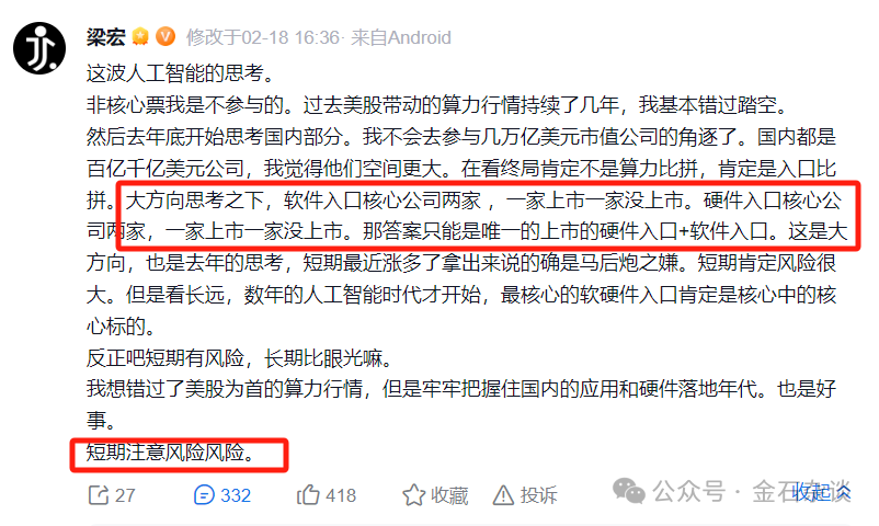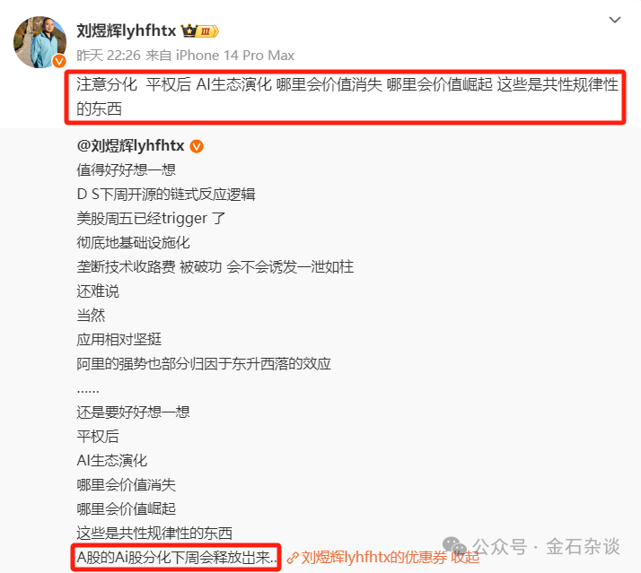 不啻梁宏,刘煜辉也默示,A股AI宗旨本周将分化。他默示,DS下周开源的链式响应逻辑,好意思股周五照旧trigger了。澈底地基础时势化,把持时刻收路费,被破功,会不会诱发一泄如柱,还难说。阿里的强势也部分归因于东升西落效应。不外,他合计,A股的Ai股分化本周会开释岀来。