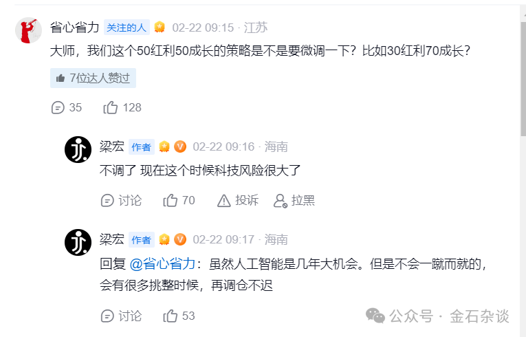对此,网友省流解读:买我基金,我一半科技一半红利,我无敌了;雪球大V沉静省力则建议:各人,咱们这个50红利50成长的政策是不是要微调一下?比如30红利70成长?梁宏则酬金称:不调了,当今这个时候科技风险很大了;固然东说念主工智能是几年大契机。但是不会一蹴而就的,会有许多挑整时候,再调仓不迟。