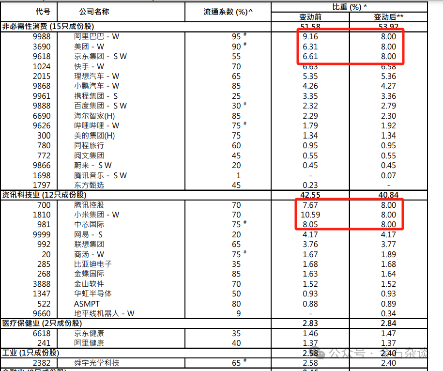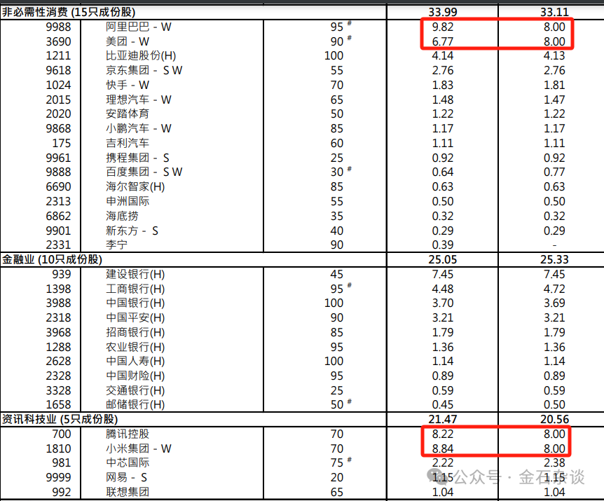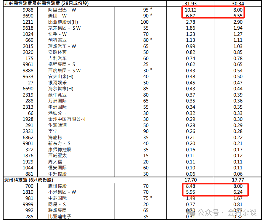 2)恒生国企指数,阿里从9.82%调降至8%,好意思团调升至8%,腾讯、小米也调降至8%,中国出动、中国联通变化不大。