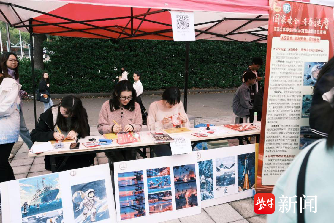 4月13日,由江苏大学艺术学院和肄业书院构成的“天际之梦、深海之谜、极地之光”志愿事业宣传团队,在学生社区开展国度安全作品展览。志愿者们以天际、深海、极地三个鸿沟为主题创作干系作品,全面展示了我国在这些鸿沟得回的光泽成立和国度安全职责的要紧冲破。